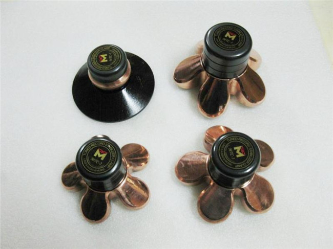 经过大量和长期的实验,凌氏音响工作室将于近期推出MTC系列唱片镇,它是采用了凌氏避震脚钉的专利技术,巧妙地利用代表中国古老五行学说基本元素的金木水火土材料加以组合,以特殊结构和精密加工制成了新颖独特的五瓣梅花型唱片镇。 以往人们以为唱片镇主要是靠其重量来镇住黑胶唱片,因为唱盘在转动的时候肯定会产生有害的震动,影响唱针对唱片沟槽中机械信息的精确拾取,因此需要适度地为唱片增加重量,以提高系统稳定度减低震动的负面影响。但实际上除了重量这个因素外,唱片镇的不同材料和结构也会影响减震效果,这跟音响器材使用避震脚钉的情况类似。